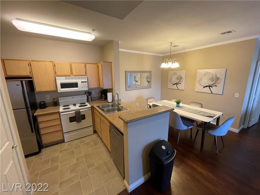 Fully furnished upgraded two bedroom two bathroom third floor condo in gated Henderson community. Amazing views from your private balcony! Enjoy all utilities, housewares, linens, WiFi, and cable TV included with your stay. Condo features upgraded flooring, granite countertops, washer and dryer in unit, and all appliances. Location is accessible to shopping, dinning, I215, and major roads. Includes community pool, spa, and fitness center. Just bring your tooth brush and clothes!