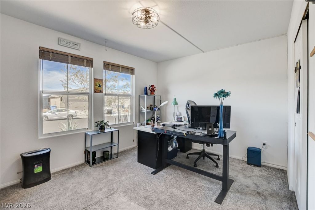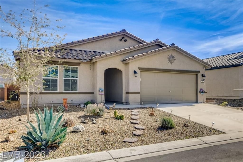 Beautifully updated 4-bedroom, 2-bath home in the country community, Solaris at Indian Springs. This open-concept floor plan features upgraded luxury vinyl plank flooring, custom designer lighting in the entry, dining, and kitchen areas, and custom wood blinds throughout. The kitchen showcases upgraded quartz countertops, enhanced sink, custom backsplash, and smart appliances including a WiFi-enabled stove and low-decibel dishwasher. WiFi garage door opener adds convenience. All bedrooms generously sized with the primary en-suite offering a separate garden tub and shower. Enjoy the private backyard with covered patio, ceiling fan, pergola, and mature plum tree. Country-style community living just 30 minutes from skiing, world class golf, shopping, and Las Vegas. Convenient to Creech AFB, enjoy the peaceful setting of this home!