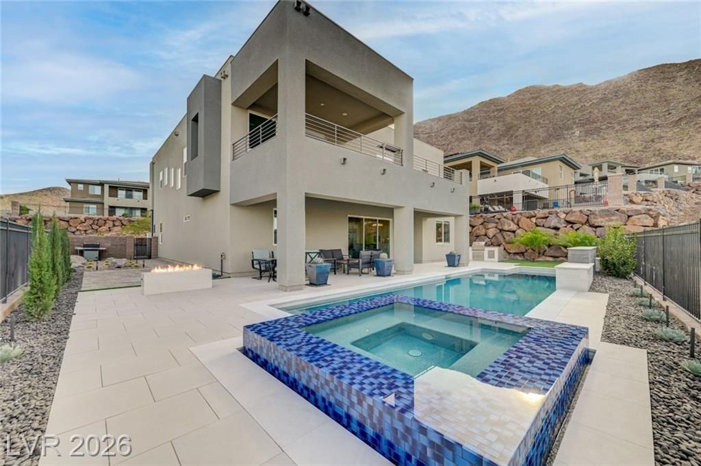 Available April 1,2026! Experience luxury in this fully furnished 5-bedroom, 4-bath masterpiece located in the exclusive Tresor community. Revel in breathtaking VIEWS of the LV STRIP & mountains in a cul-de-sac. Newly built huge pool & spa with kitchen & fire pit.This 2024 built SOLAR designer home features a convenient 1st-floor bedroom & office. The interior includes tile flooring, a gourmet chef's kitchen with high-end SS appliances, 72-inch fridge, extended cabinetry & spacious illuminated center island. An open floor plan showcases designer furniture, art, flat screens TV's and 3 dramatic LED fireplaces with floor 2 ceiling tile, loft and a bar. The sizable 2floor laundry room doubles as a gym.Enjoy luxurious motorized curtains, dramatic designer lighting, and art throughout. With elegant quartz and marble counters, acoustic lit panels create a refined atmosphere. Smart home technology includes alarm, security cameras, garage door app,RING doorbell + EV charger.
