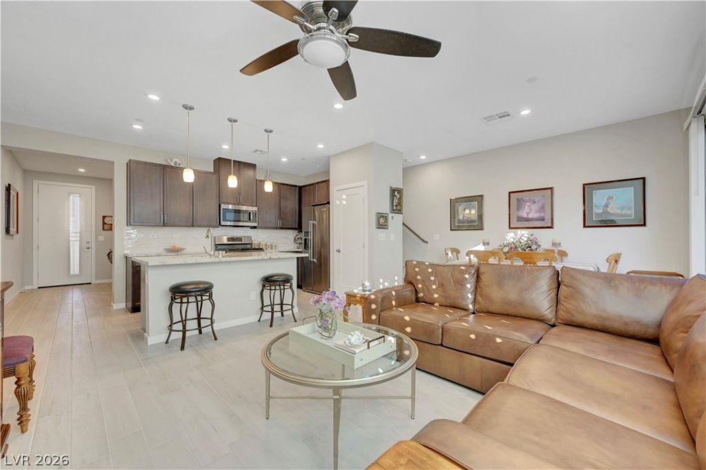 Welcome to 9291 Desert Pearl Ave, a modern gated townhome in Southwest Las Vegas. This home features 2 bed and 2.5 baths, along with a versatile loft ideal for a home office or additional living space. The open-concept floor plan offers bright, inviting living areas designed for both everyday comfort and entertaining. The gourmet kitchen showcases a large center island with breakfast bar seating, ample pantry storage, and seamless flow into the dining and living areas. Enjoy a private, low-maintenance backyard, perfect for relaxing or hosting guests. The primary suite includes dual sinks, a tub/shower combination, and a spacious walk-in closet. A secondary bedroom with a full bathroom provides flexibility for guests or family. Located in a gated community with resort-style amenities including a pool, BBQ area, and gated pet park, this home also offers a 2-car attached garage and convenient access to shopping, dining, and major commute routes.